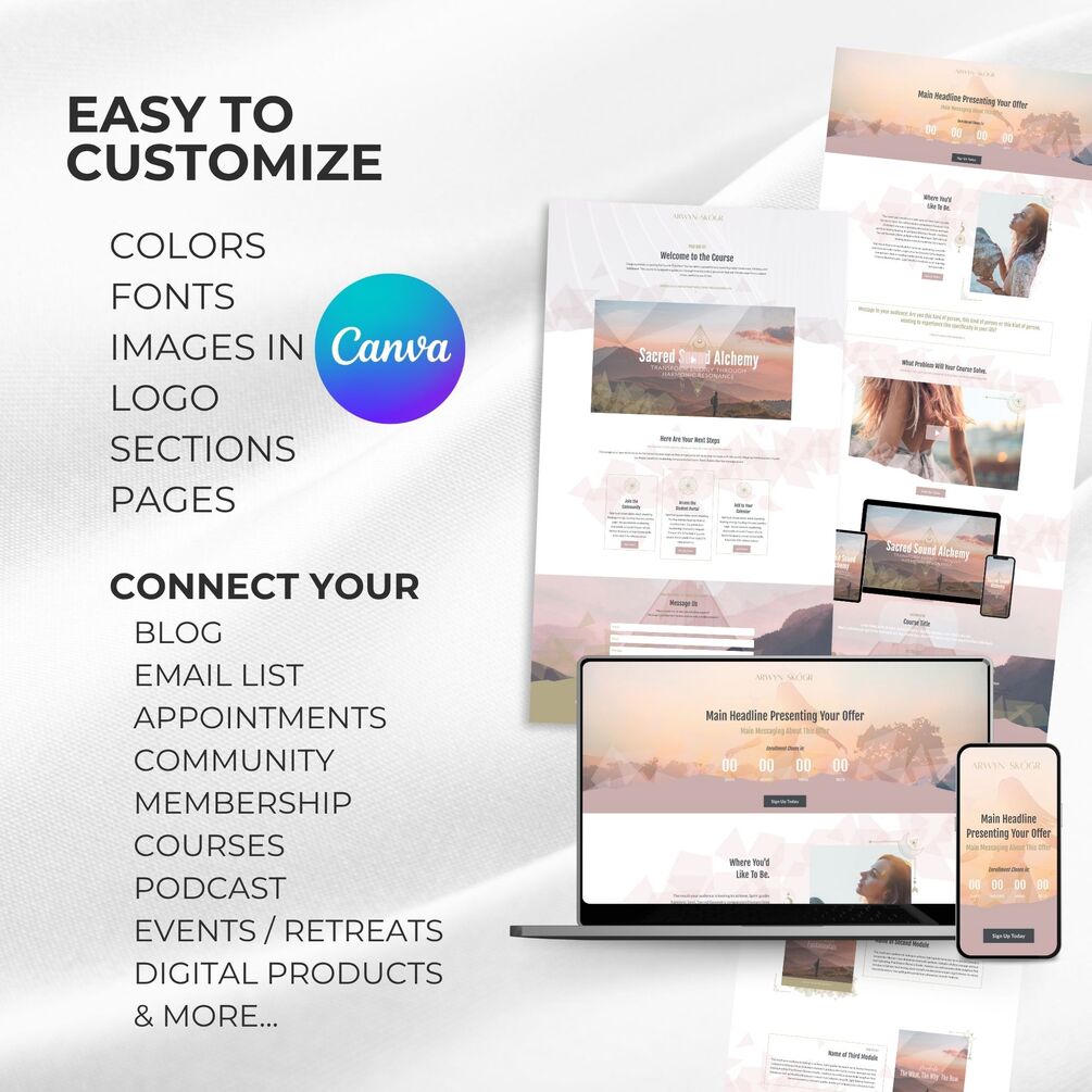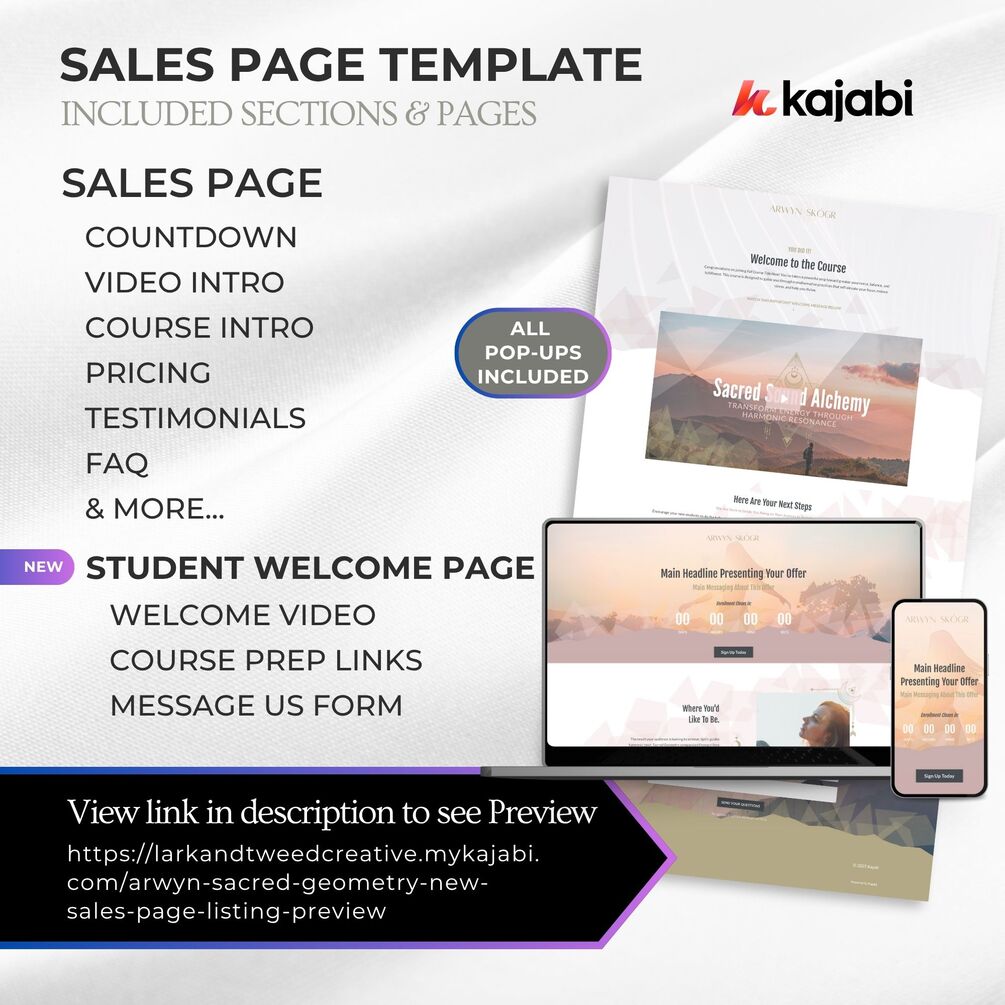 The Arwyn SACRED GEOMETRY Kajabi Sales Page Landing Page Template is a beautifully designed, prebuilt Landing Page themes for coaches, course creators, and spiritual entrepreneurs who are ready to elevate their brand and launch with confidence.