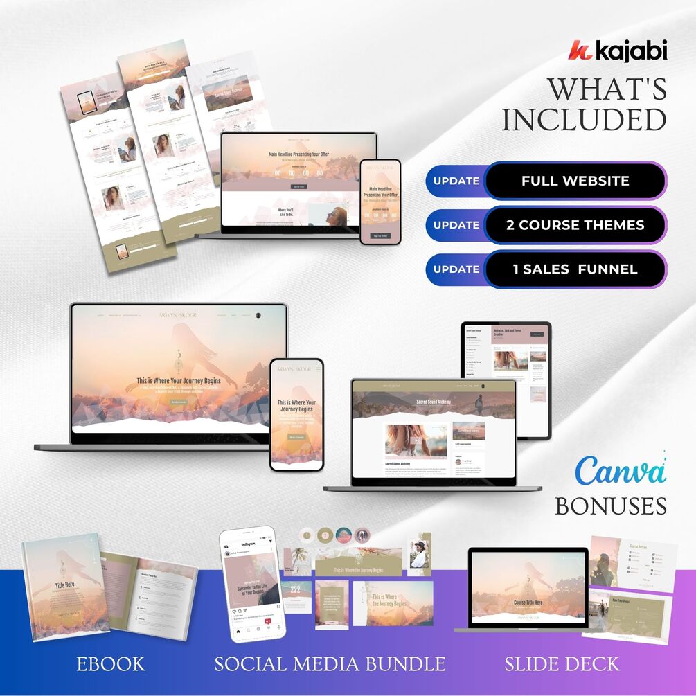 The Arwyn SACRED GEOMETRY Kajabi Course Creator Bundle that includes an 20+ Page Website Template now with Podcast and Case Study Pages, Sales & Opt-in Funnel, Course Themes, Social Media Ebook Workbook, and Slide Deck are beautifully designed, prebuilt templates for coaches, course creators, and spiritual entrepreneurs who are ready to elevate their brand and launch with confidence.