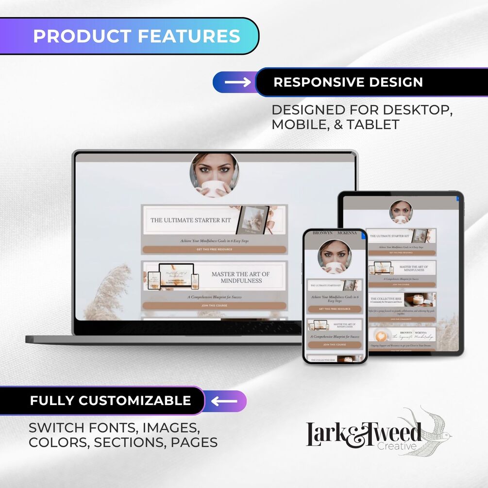 Designed by Lark & Tweed Creative, this Kajabi theme saves you time, energy, and money—while giving you everything you need to show up with clarity, intention, and visual harmony.
