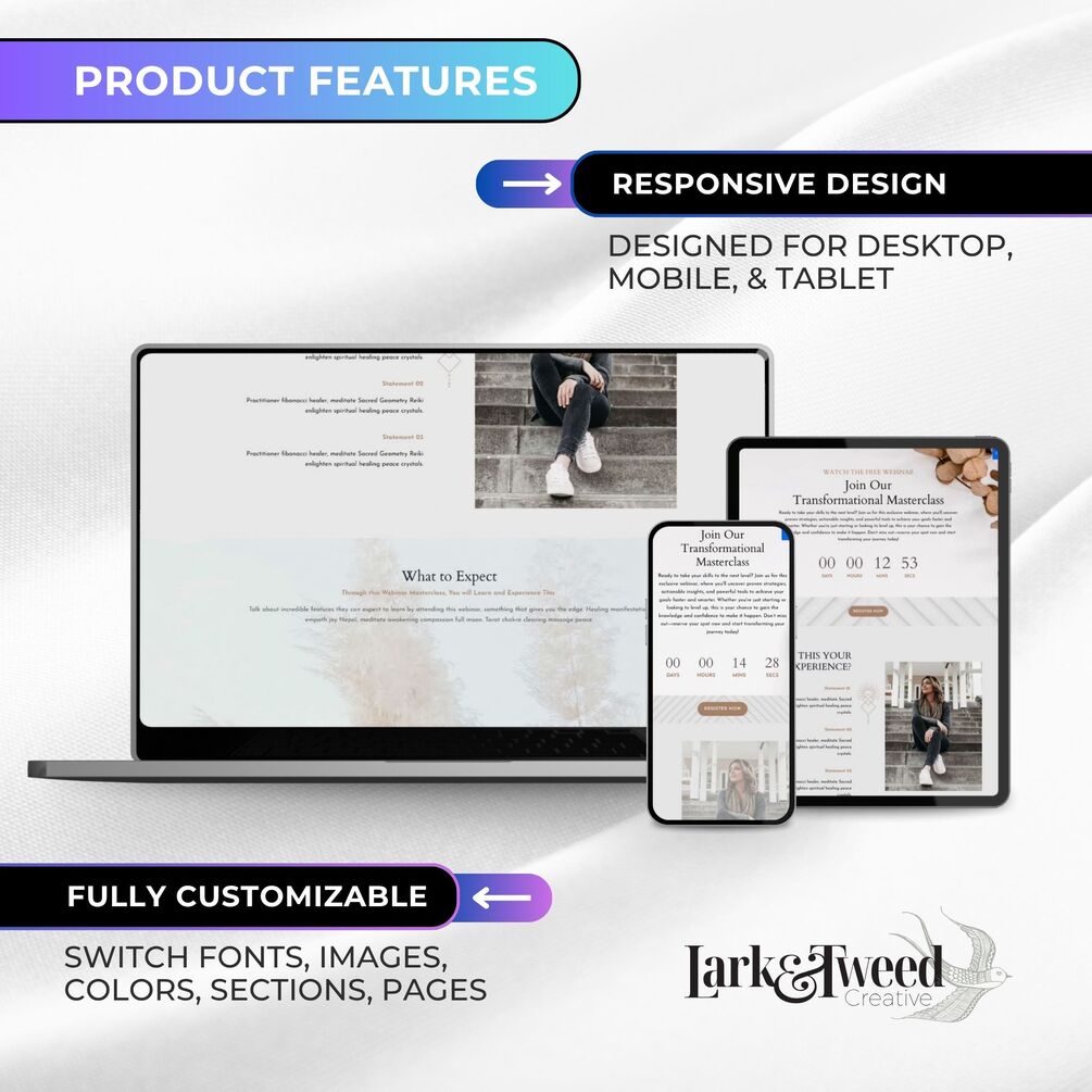 The BOHO Kajabi 4 Page Webinar Funnel Template Bundle are beautifully designed, prebuilt Landing Page themes for coaches, course creators, and spiritual entrepreneurs who are ready to elevate their brand and launch with confidence.