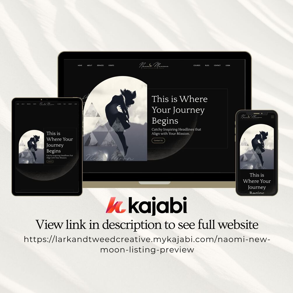 This Beautiful, Inspired by the New Moon KAJABI Website Template, will allow your course and coaching business to standout. With a professional website theme that includes everything you would need to be seen and convert visits into sales. All images are easy to edit and make your own in Canva. The simplicity and minimalistic approach of this this theme allows for endless possibilities.