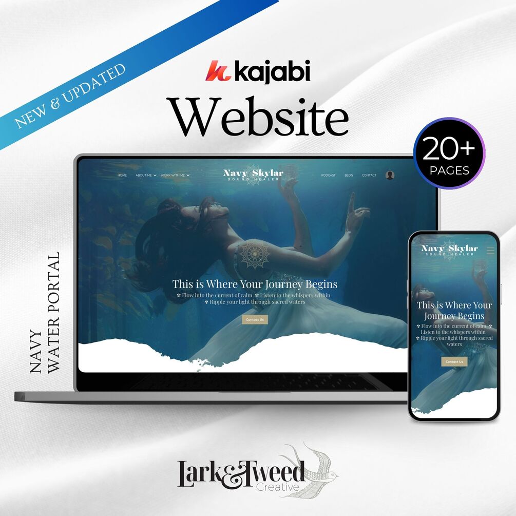 The Navy WATER PORTAL Kajabi 20+ Page Website Template now with Podcast and Case Study Pages is a beautifully designed, prebuilt website theme for coaches, course creators, and spiritual entrepreneurs who are ready to elevate their brand and launch with confidence.