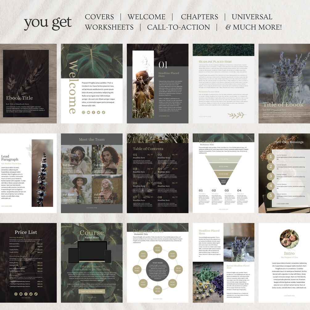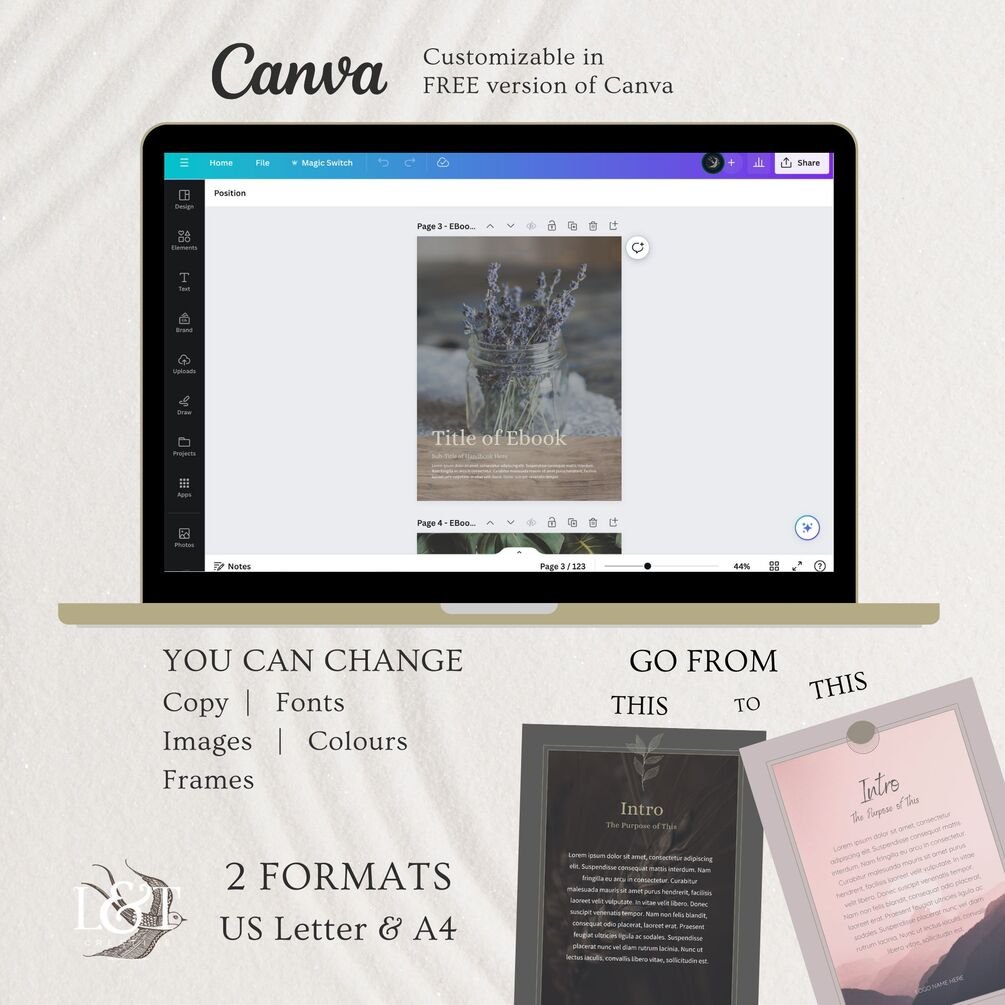 This Beautiful, Inspired by Herbalists and Greenery Ebook and Workbook Canva Template, will allow you to create such an inspiring and attractive mood for your audience. With over a 120 pages in both US Letter & A4 formating, you have unlimited possibilities and layouts to choose from. This will allow you to truly personalize your Ebooks and Workbooks to your current brand. Having been created in Canva, this also allows you the flexibility to change and adjust images, fonts, colours and more to your liking.
