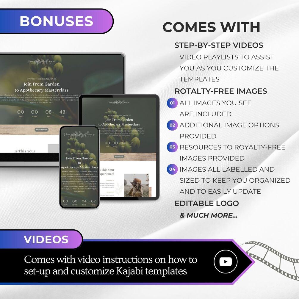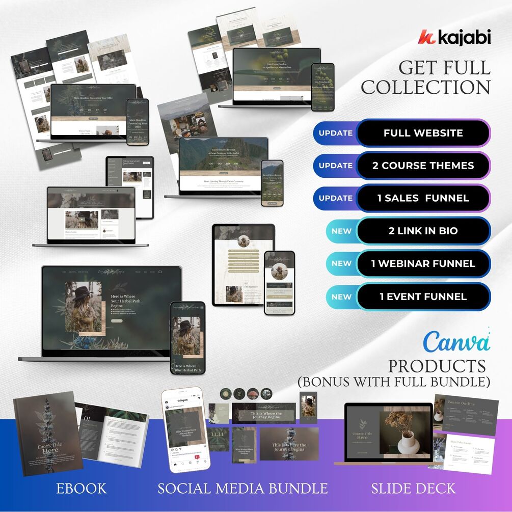 The Summer HERBALIST Kajabi 4 Page Webinar Funnel Template Bundle are beautifully designed, prebuilt Landing Page themes for coaches, course creators, and spiritual entrepreneurs who are ready to elevate their brand and launch with confidence.