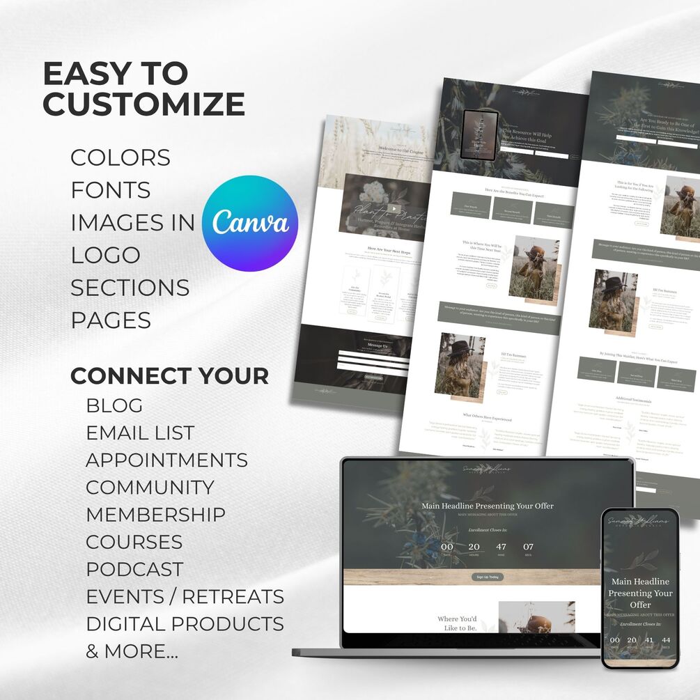 This Beautiful, Inspired by Herbalism KAJABI Sales Funnel Template Bundle Template, will allow your audience to easily connect to your course and coaching business. With a professional Sales Funnel that includes a Long Form Sales Page, Waitlist Page, Lead Magnet Opt-In Page. All images are easy to edit and make your own in Canva with links included in the instructions. The simplicity and minimalistic approach of this this theme allows for endless possibilities.